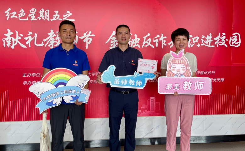 9月10日,温州大学资产公司、保卫处联合人行温州市中心支行、招商银行温州分行在温州大学校园开展“学党史、办实事”系列活动之“红色星期五:金融反诈知识进校园”主题党日活动。在第37个教师节来临之际,校银携手为高校师生送上一份特殊的节日“礼物”。