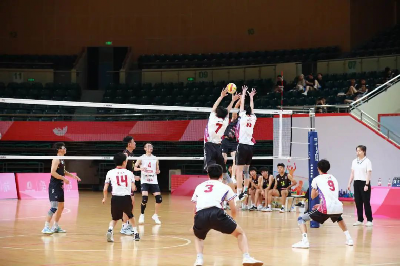 本次比赛该校男排对阵杭州师范大学男排,赛况异常激烈焦灼,双方比分交替上升。该校男排主教练李鹤洲重新调整战术,队员们转守为攻、敢打敢拼,最终以2:1连扳两局,拿下比赛。