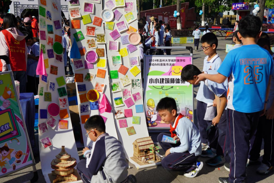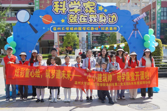 温州大学城附属学校的科普集市上,温州大学建筑工程学院摊位前挤满了小朋友,小朋友们七嘴八舌地讨论着。小小建筑师研学团队的学生们从最基本的结构稳固性入手,由浅入深、循序渐进地讲解着每一个小房子内部的奥秘。瞧,从校园到操场遍地是学生实践体验的身影。这项具有建筑工程学院专业特色的公益课堂已经坚持了十年。