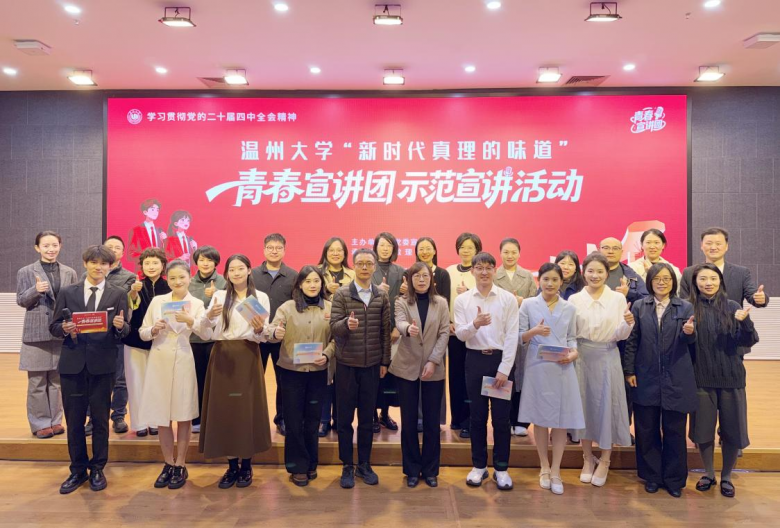 近日,温州大学步青厅里传来阵阵掌声。温州大学“新时代真理的味道”青春宣讲团示范宣讲活动在此举行,7位“8090”和“00后”青年师生宣讲员轮番开麦,用“青言青语”宣讲党的二十届四中全会精神,为现场300余名师生带来一堂生动的思政大课。