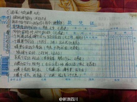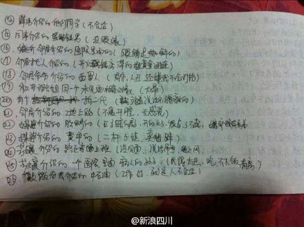 13日,一则四川妹儿相亲清单火爆网络。网帖称,妹纸是个会计,现在24岁,从20岁相亲至今,列出了31个海选人!!用妹纸的话说:“喜欢的太屌丝,想将就又觉得没面子,条件好的没有安全感,条件差的物质上又满足不了……”via新浪四川