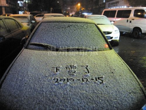 2010年12月15日,市民在汽车引擎盖的积雪上划出“2010.12.15”字样。