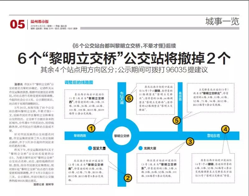 今年3月,温州都市报全媒体报道了市区“6个公交站台都叫黎明立交桥,市民出行遇困扰”一事引发关注。