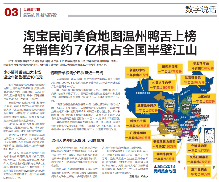 昨天,淘宝网发布2018民间美食地图,全国各地10多种民间美食上榜,其中就有温州酱鸭舌,过去一年在淘宝网卖出的酱鸭舌达到10万件;除了酱鸭舌,温州人也爱吃泡椒凤爪,一年要花上百万元。
