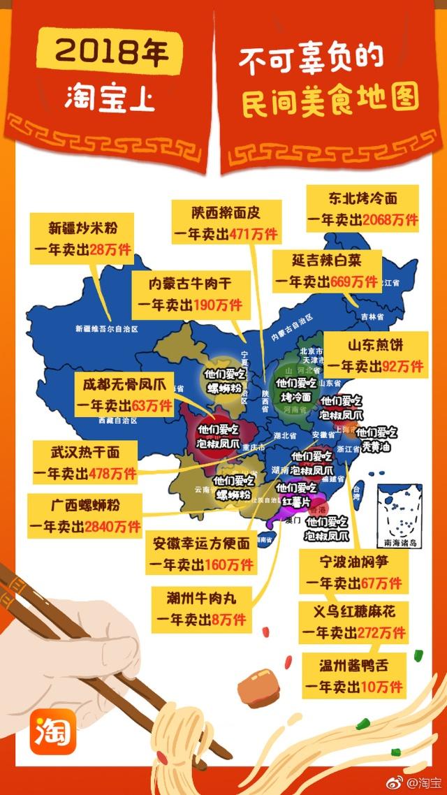 淘宝网此次发布的2018民间美食地图,上榜的有广西螺蛳粉、武汉热干面、内蒙古牛肉干、山东煎饼、成都无骨凤爪、温州酱鸭舌等,其中广西螺蛳粉年卖2840万份,在数量上居榜首。