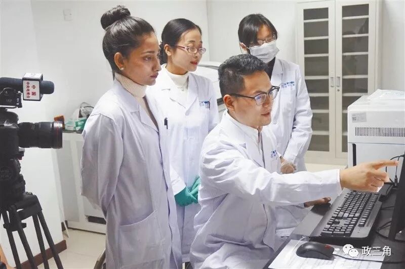 图为央视到优牙生物采访,拍摄了叶青松指导学生及员工做实验、提取干细胞进行检测的镜头。