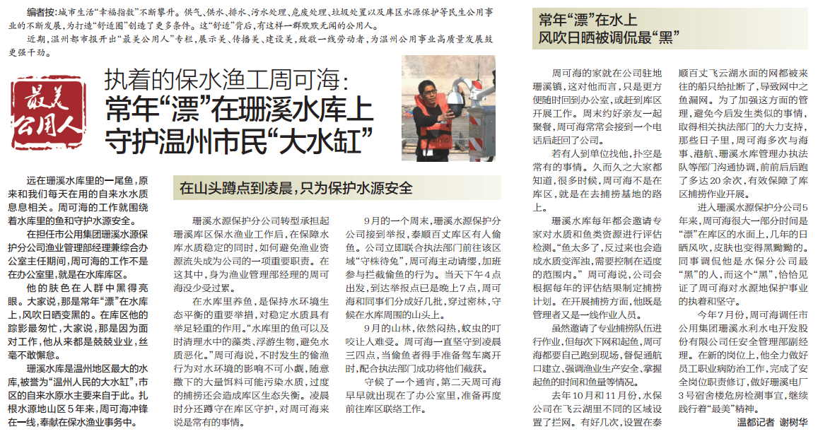 在担任市公用集团珊溪水源保护分公司渔业管理部经理兼综合办公室主任期间,周可海的工作不是在办公室里,就是在水库库区。
