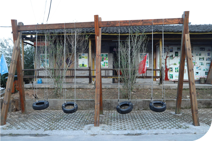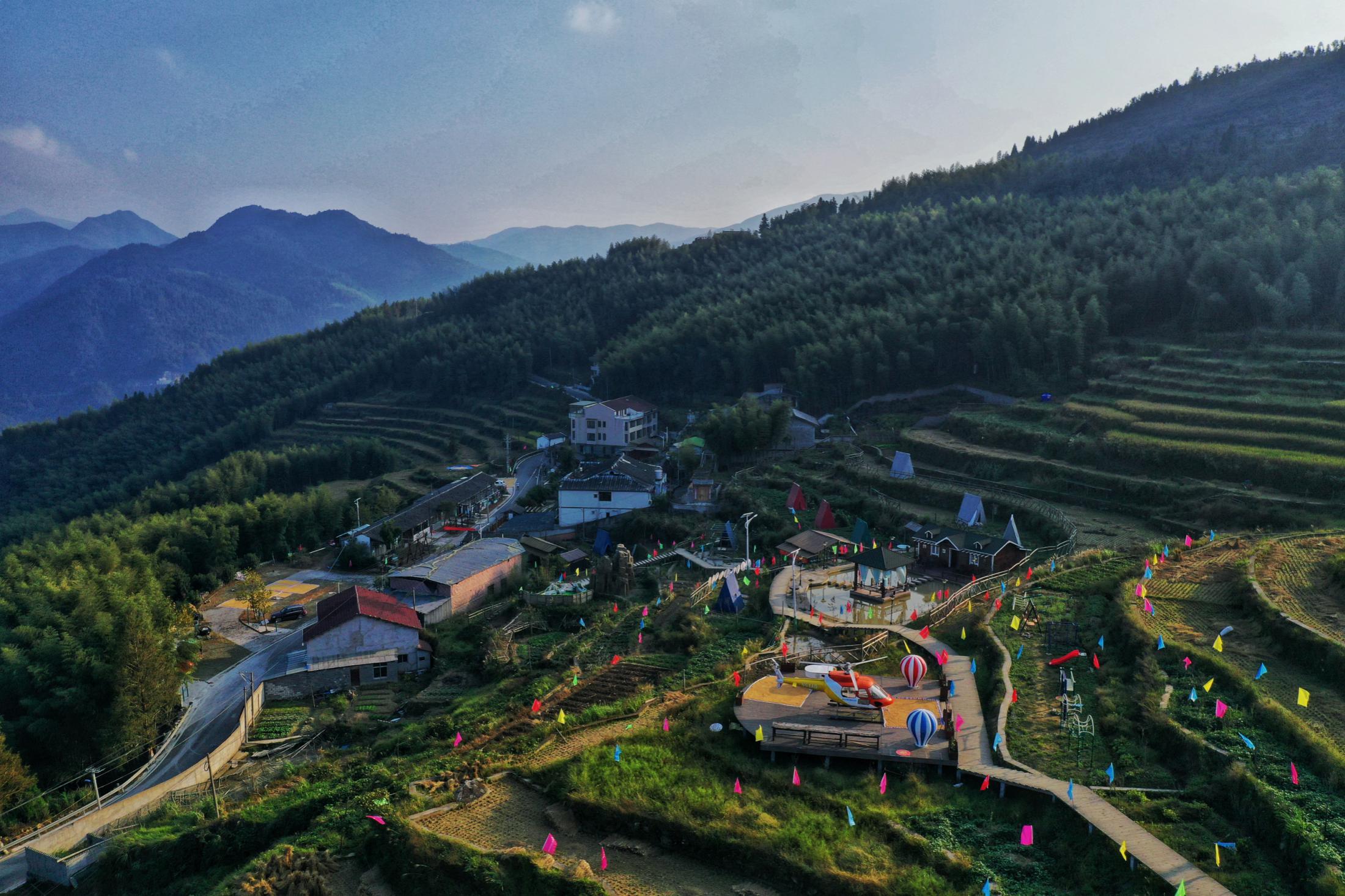 在基地依山而建的步道慢步,两边布置着各种场景,风车梯田田野风、飞机钢琴高大风,公主恐龙儿童风……到了山顶,视野开阔,如果天气不错,远处的泽雅湖清晰可见。迎风而立,闭上眼睛放肆呼吸,风带来泥土的芬芳、竹林的清香。