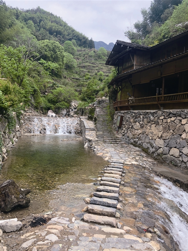 一进村,一条不知名的小溪从山上流下,潺潺的溪水声贯穿整座山村,两座石拱桥与三座木廊桥高低走向不同地架设在溪涧之上,随便停留一处,眼前都可入画。漫步青石板铺就的路,仰望青瓦铺盖的民居,欣赏袅袅升起的炊烟,颇有情调。