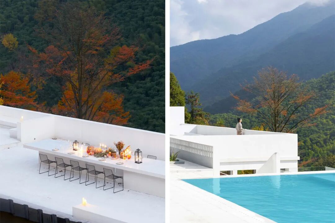 这个酒店看外形就很可爱了,在抖音无敌火。每个房间都有能仰望星空的琉璃屋顶,实在太适合拍照了。带着孩子还可以去中南百草园和浙江自然博物馆游玩一番。可以一家人来玩,也可以约上几个家庭一同前往,五室一厅的套房绝对能容纳。目前预定软件上还可以预定的到哦。坐落在半山腰的民宿,俯瞰山景,纯白的主色调、灰调的内饰是最流行的性冷淡风。在绿意盎然的山林里,显得更特别。这个民宿是今年刚开业的,价格也比较高,从829元~2162元。