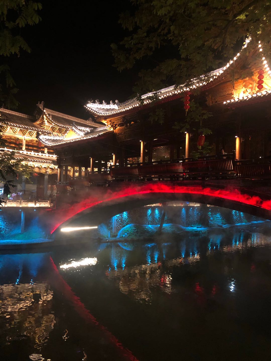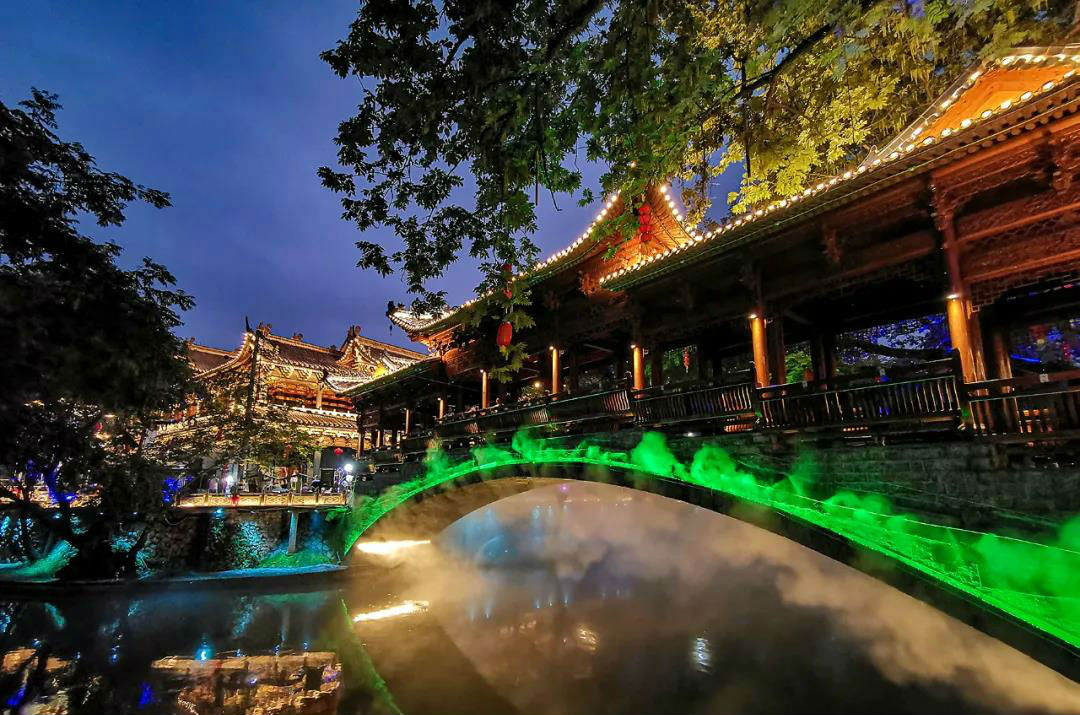 华灯初上,入夜的青街灯光璀璨,古朴典雅的街景和民居,在夜色中换了姿态登场,倒映在忽明忽暗的潺潺流水里,让游客恍如置身梦境,流连忘返。