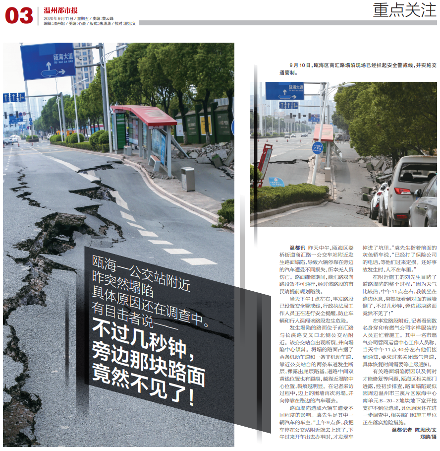 今天中午,瓯海区商汇路一公交车站附近发生塌陷,现场已经拦起安全警戒线,并实施交通管制。
