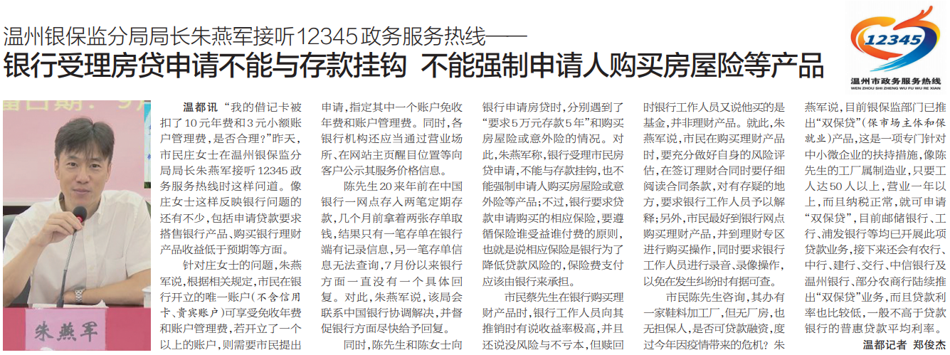 “我的借记卡被扣了10元年费和3元小额账户管理费,是否合理?”9月14日,市民庄女士在温州银保监分局局长朱燕军接听12345政务服务热线时这样问道。像庄女士这样反映银行问题还有不少,包括申请贷款要求搭售银行产品、购买银行理财产品收益低于预期等方面。
