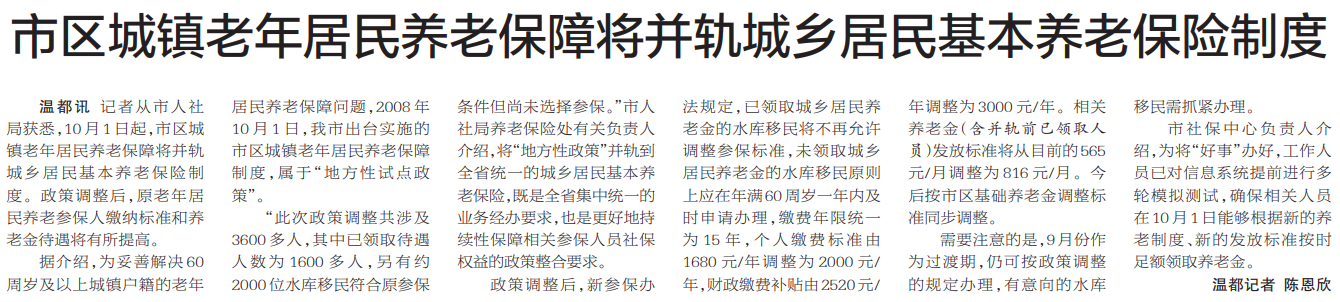 记者从市人社局获悉,10月1日起,市区城镇老年居民养老保障将并轨城乡居民基本养老保险制度。政策调整后,原老年居民养老参保人缴纳标准和养老金待遇将有所提高。
