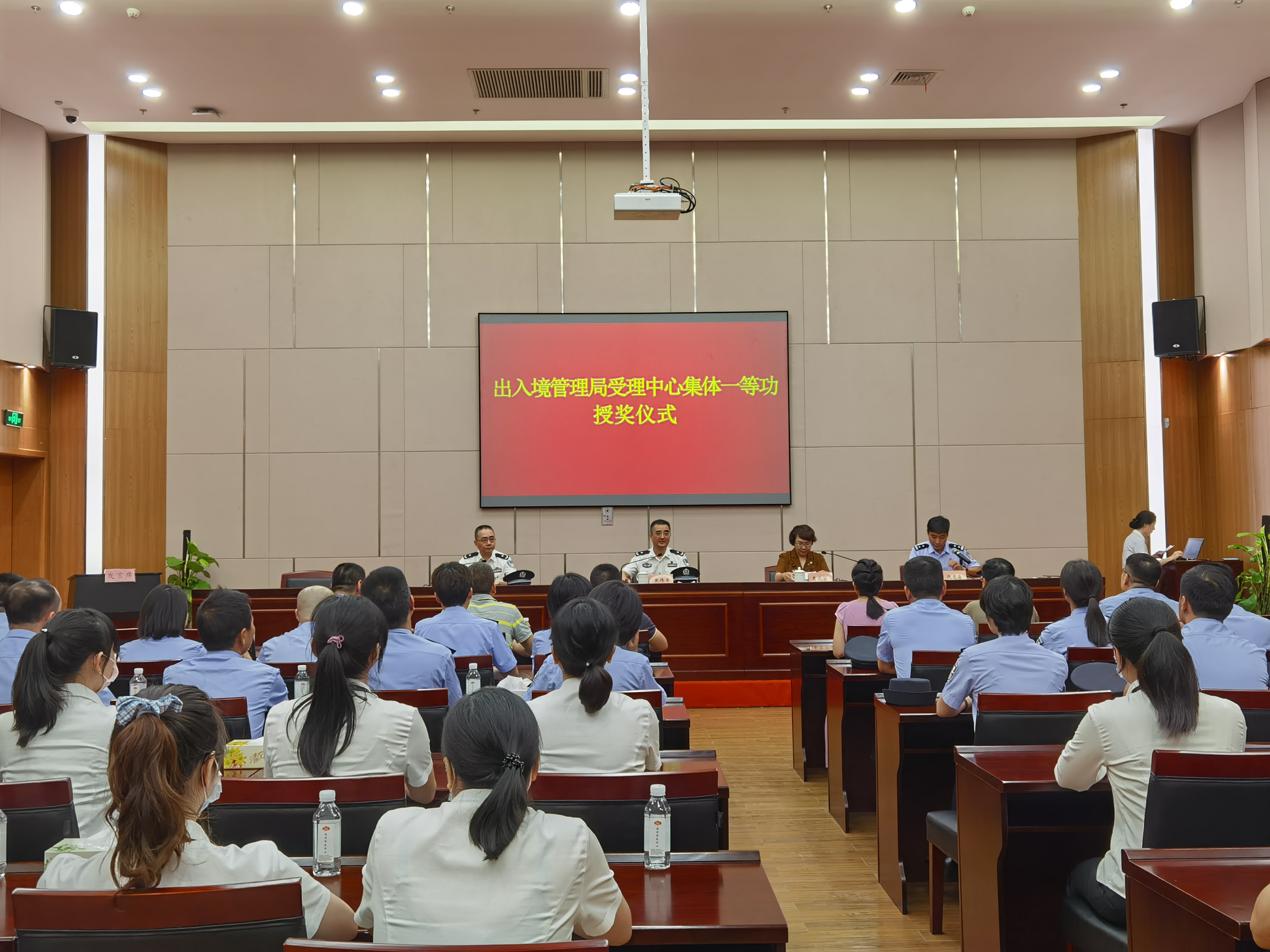 今天上午,市公安局出入境管理局受理中心荣获公安部集体一等功的授奖仪式在温州市民中心举行。
