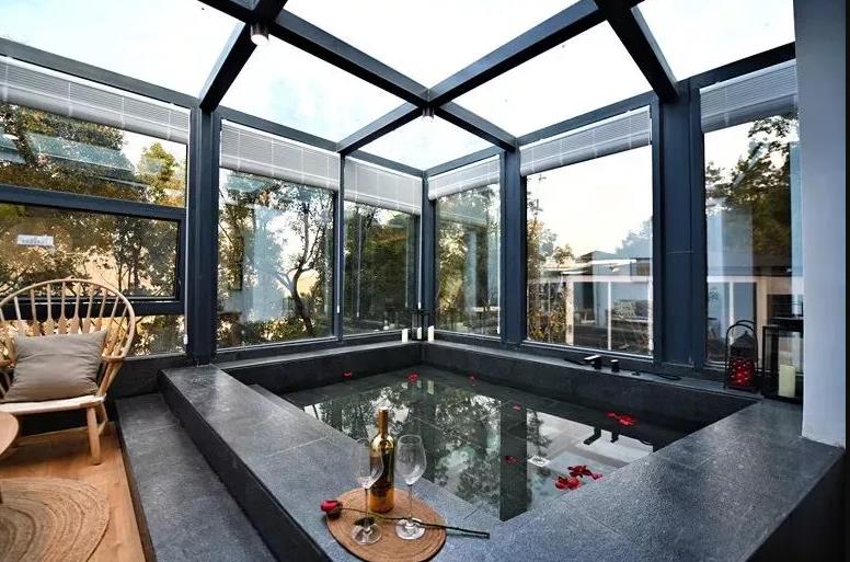 二楼客房有2个面积均超过200平方米的跃层套房,房间内配置了餐厅、客厅、休闲区等,那自带全景天窗的池子,是孩子们的天堂,在阳光明媚的下午,做一个阳光浴,玻璃外的花鸟鱼虫仿佛有了新的注脚,不再如处暑那般生机活泼,喧嚣渐渐沉了下去,山间的沉寂将万物包裹了起来,心会忽然一下子安静下来。