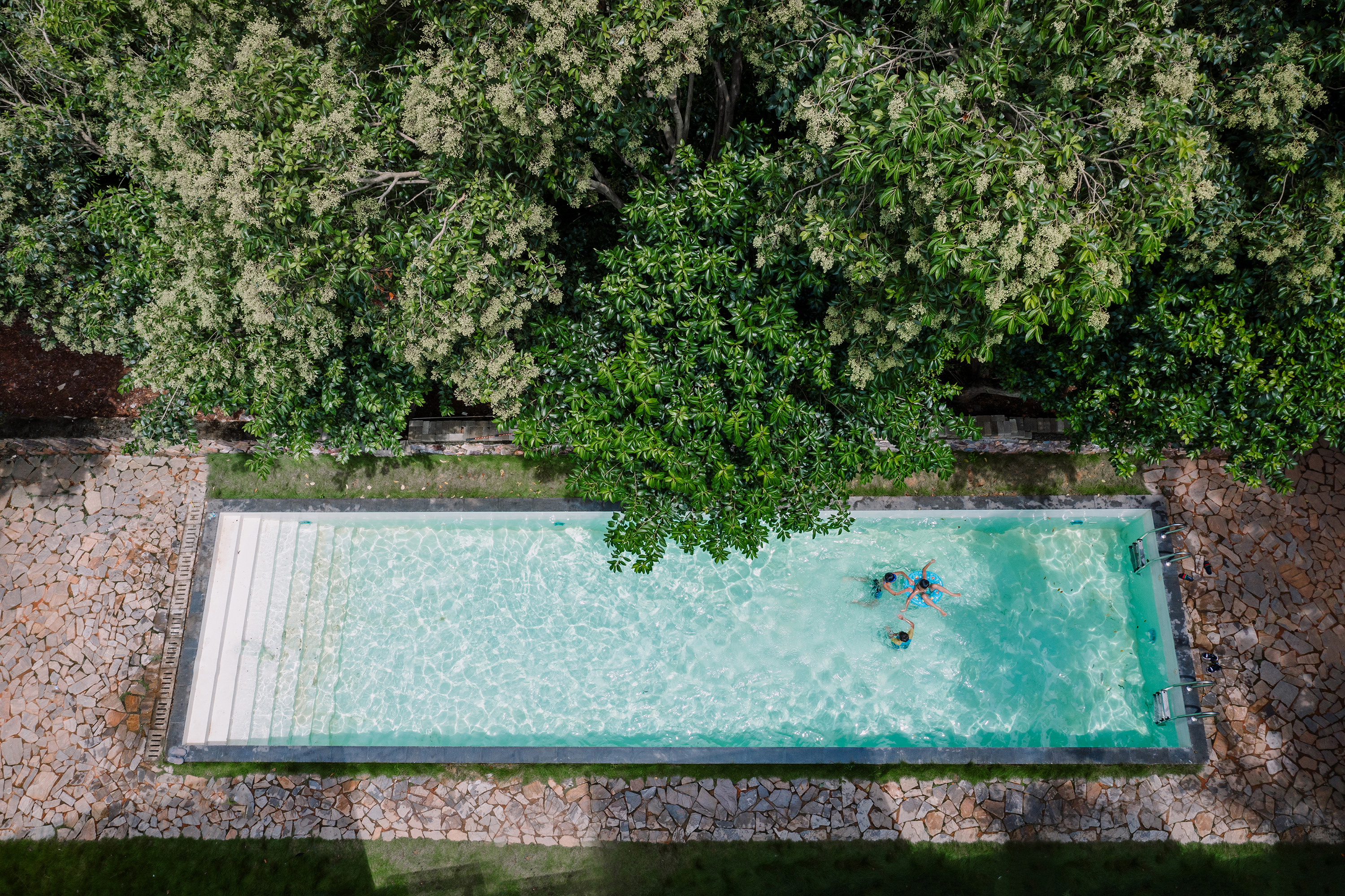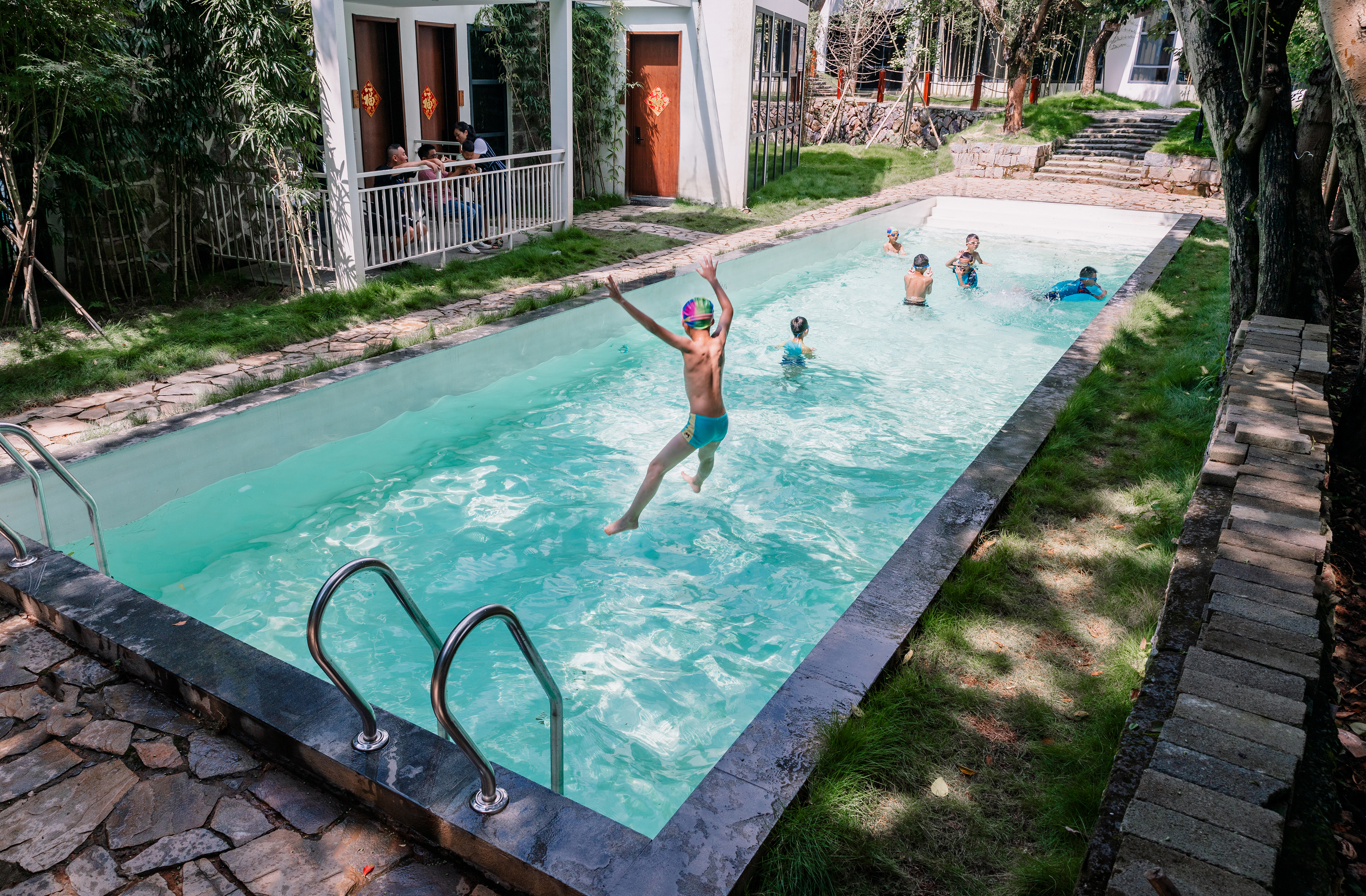 民宿外还有一处户外泳池,是拍美照的绝佳地,也是溜娃的好去处。盛夏时分,在这里扑腾一下,起身时混身除了清冽的山泉,还有那凉飕飕的山风,仰头一口气喝完一小瓶啤酒,爽。
