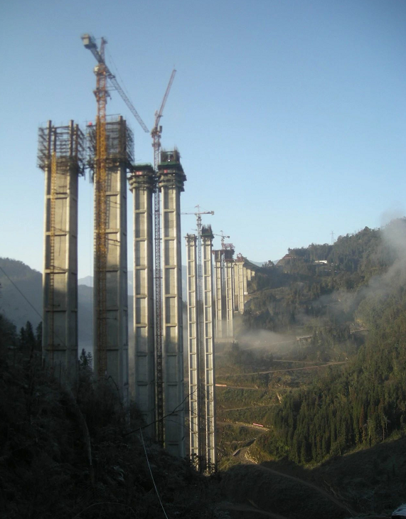 路港集团承建的雅泸高速C4标段是整个项目的控制性工程。其中的腊八斤连续刚构特大桥作为全段难度最大的部分,创下了我国甚至国际桥梁建设史上的多项第一:一是主桥的10号墩高达182.5米,为同类型桥梁世界第一高墩;二是在国内桥梁建设中首次运用钢管混凝土叠合柱施工新技术;三是研发C80高强混凝土高抛自密式新技术、新材料、新工艺,独创了将混凝土通过泵车一次性从山脚输送到200米高新技术;四是通过和国内多所知名高校开展校企合作,运用前沿技术指导施工,通过实践优化理论基础,改写了高墩施工、高新能混凝土施工新规范,重新编写了作为行业规范的《桥梁高性能混凝土制备与应用技术指南》与《混凝土梁式桥梁实施技术指南》。
