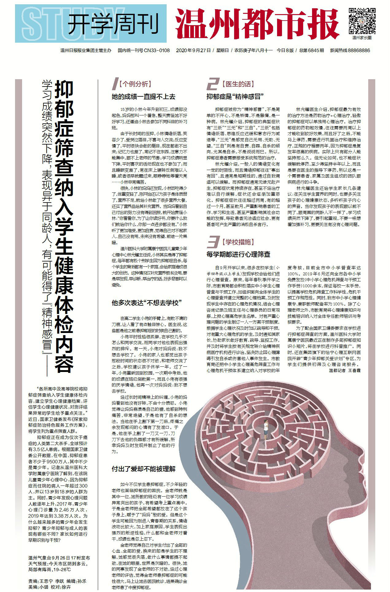温州医科大学附属康宁医院儿童青少年心理中心林光耀主任说,小林其实是得了抑郁症,每年都有极个别学生因为抑郁症自杀,每个学生的背后都有一个家庭,会给家庭造成很大的创伤。这种情况仅补充营养根本没用,要是早发现、早诊断、早治疗的话,好多悲剧可以避免。