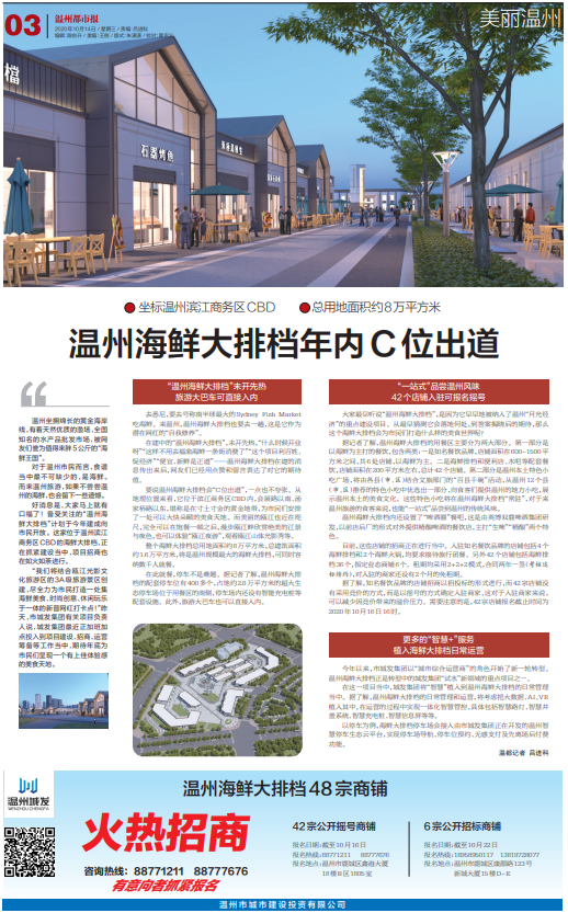 “我们将结合瓯江光影文化旅游区的3A级旅游景区创建,尽全力为市民打造一处集海鲜美食、时尚创意、休闲玩乐于一体的新晋网红打卡点!”10月13日,市城发集团有关项目负责人说,城发集团最近正加班加点投入到项目建设、招商、运营筹备等工作当中,期待年底为市民们呈现一个更好体验感的美食天地。