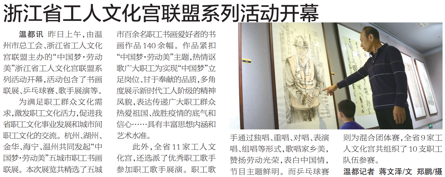 10月15日上午,由温州市总工会、浙江省工人文化宫联盟主办的“中国梦·劳动美”浙江省工人文化宫联盟系列活动开幕,活动包含了书画联展、乒乓球赛、歌手展演等。