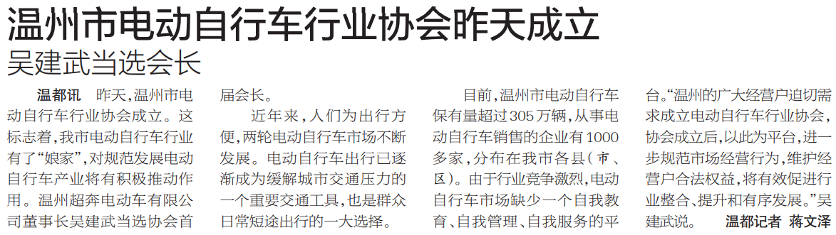 “温州的广大经营户迫切需求成立电动自行车行业协会,协会成立后,以此为平台,进一步规范市场经营行为,维护经营户合法权益,将有效促进行业整合、提升和有序发展。”吴建武说。