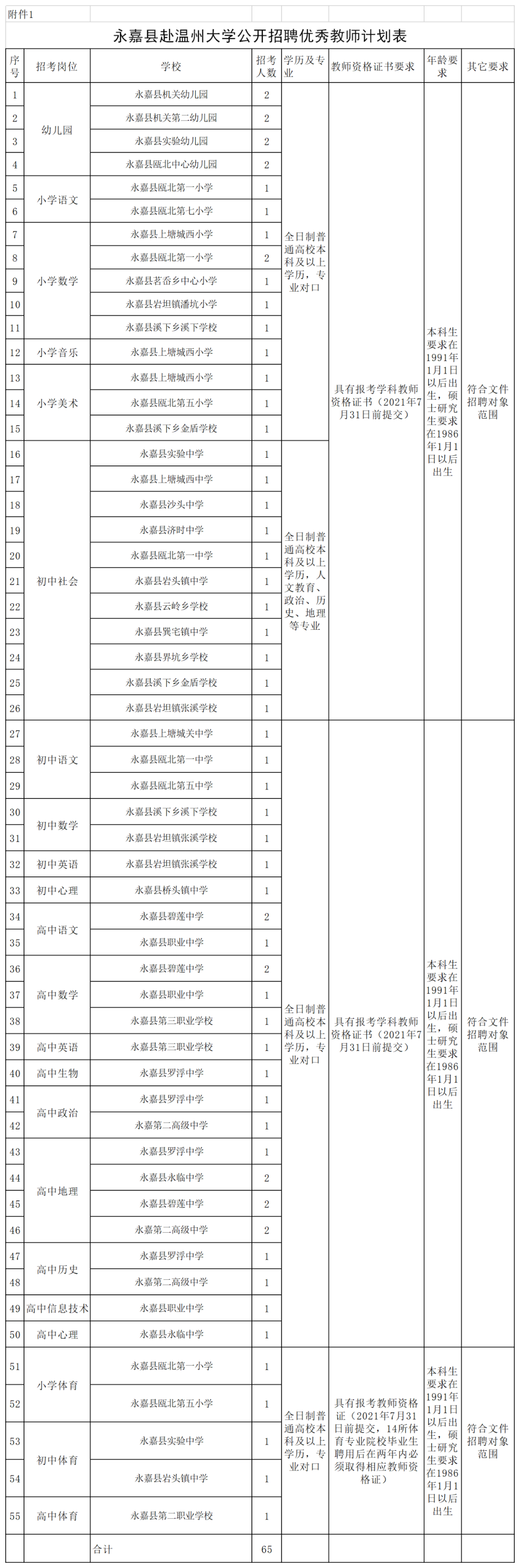 本次计划公开招聘公办学校教师65名。