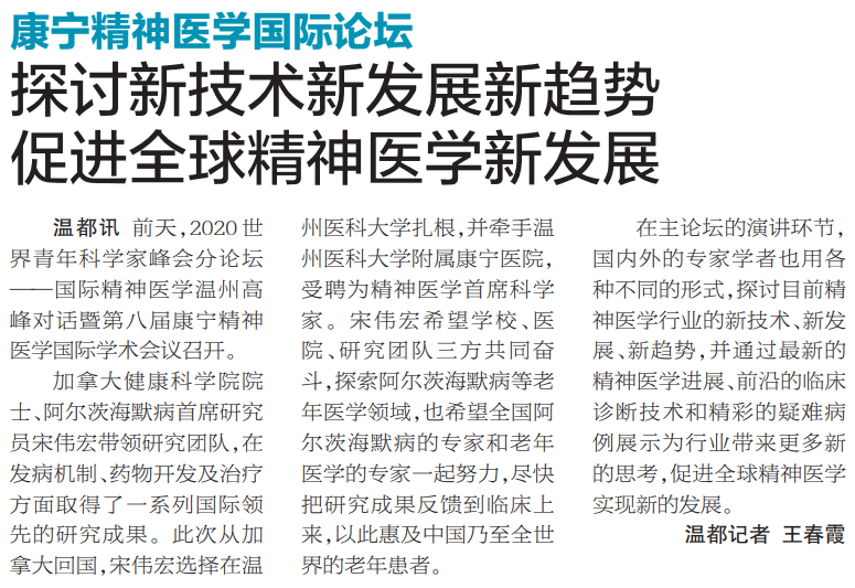 加拿大健康科学院院士、阿尔茨海默病首席研究员宋伟宏带领研究团队,在发病机制、药物开发及治疗方面取得了一系列国际领先的研究成果。此次从加拿大回国,宋伟宏选择在温州医科大学扎根,并牵手温州医科大学附属康宁医院,受聘为精神医学首席科学家。宋伟宏希望学校、医院、研究团队三方共同奋斗,探索阿尔茨海默病等老年医学领域,也希望全国阿尔茨海默病的专家和老年医学的专家一起努力,尽快把研究成果反馈到临床上来,以此惠及中国乃至全世界的老年患者。