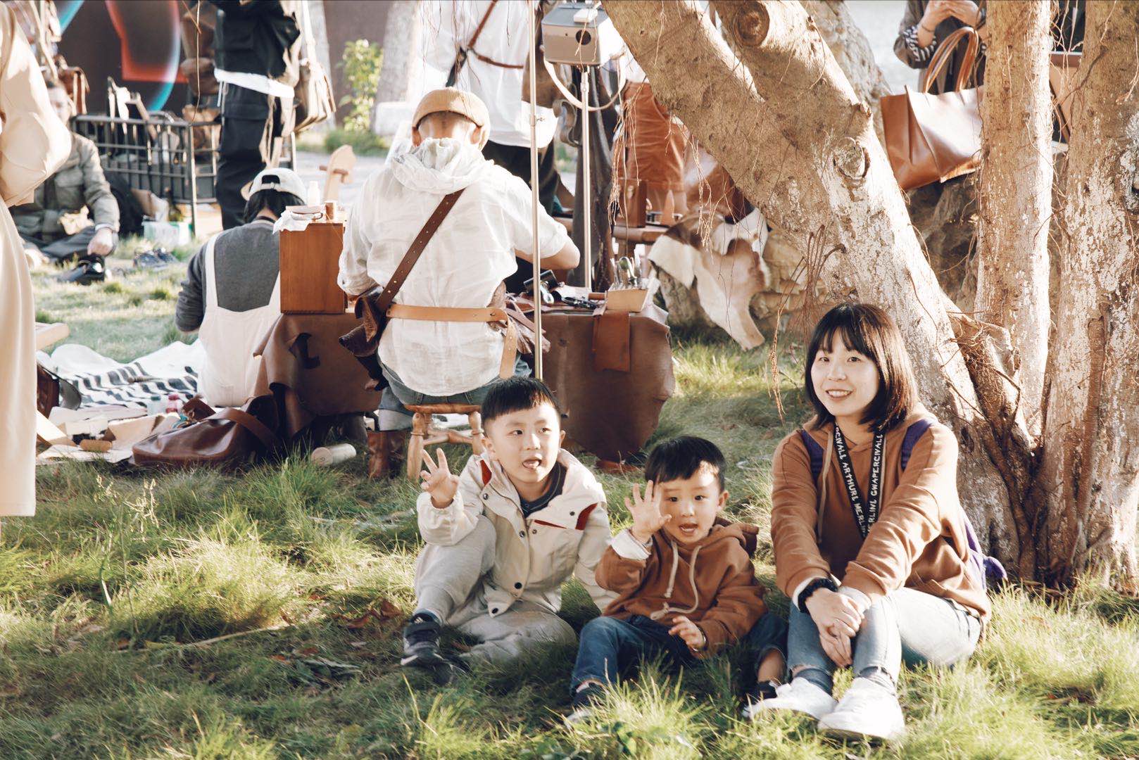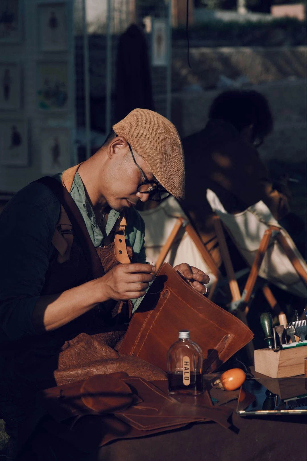 邵诚训,圈内人称“东来”,由他2014年创办的“DDV”工作室,为客户量身定做手工皮包。此次市集,他把摊位选在了塘河边上。阳光配草坪,帐篷设茶座,皮具随性地挂着,东来坐在其中,全神贯注地缝制,额头上不时会滴下汗珠。这两天,东来的手工皮具非常受欢迎,往来市民络绎不绝,驻足欣赏,不时询价。