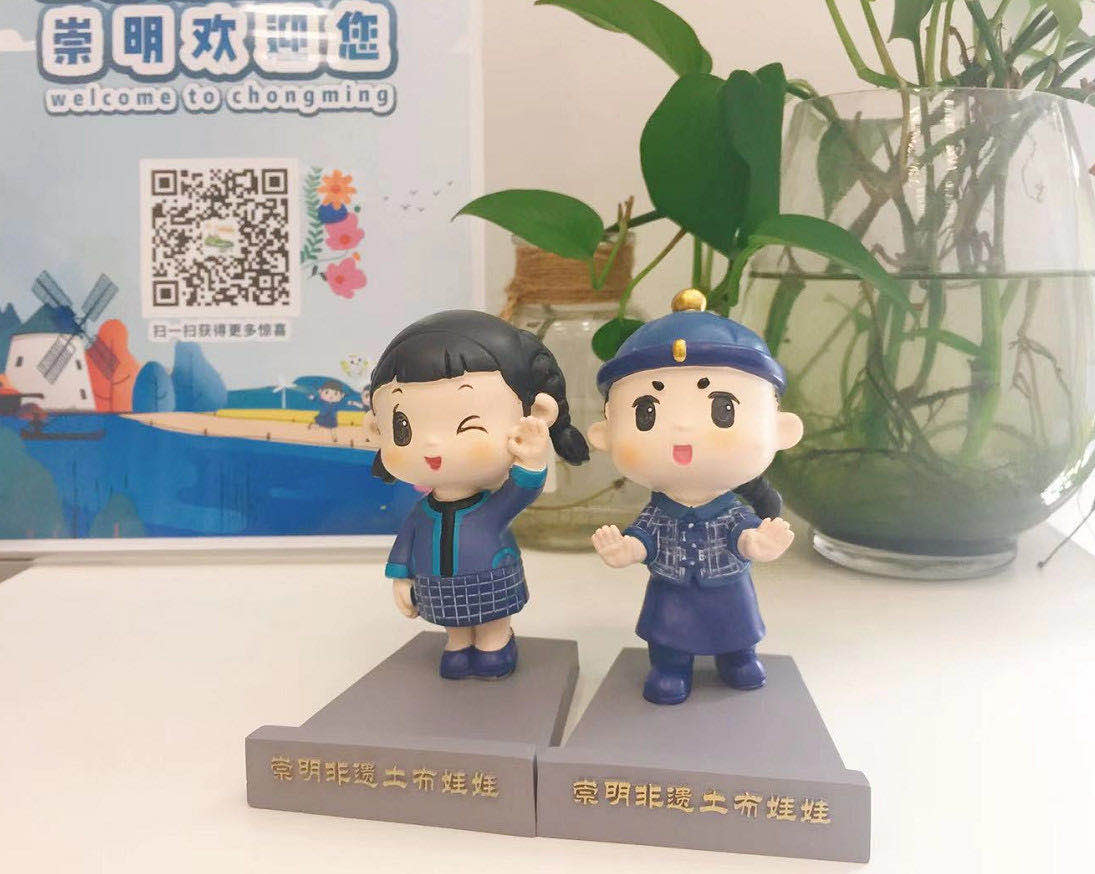 去年,崇明区文化和旅游局隆重推出了崇明方言表情包,也是首次崇明官方出品系列表情包,共有三期,分别是“乌小娘阿布”、“崇明土布娃娃一”、“崇明土布娃娃二”,受到了网友们的欢迎。此外,围绕这个IP形象设计开发了一组崇明土布娃娃手机支架,手机支架有女娃“乌小娘”以及男娃“乌小哈”两个系列,借助萌萌的形象、传神的姿态传递着乡土的情趣。