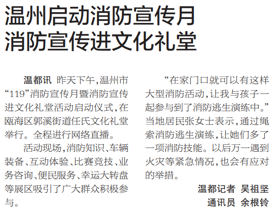 11月8日下午,温州市“119”消防宣传月暨消防宣传进文化礼堂活动启动仪式,在瓯海区郭溪街道任氏文化礼堂举行。全程进行网络直播。