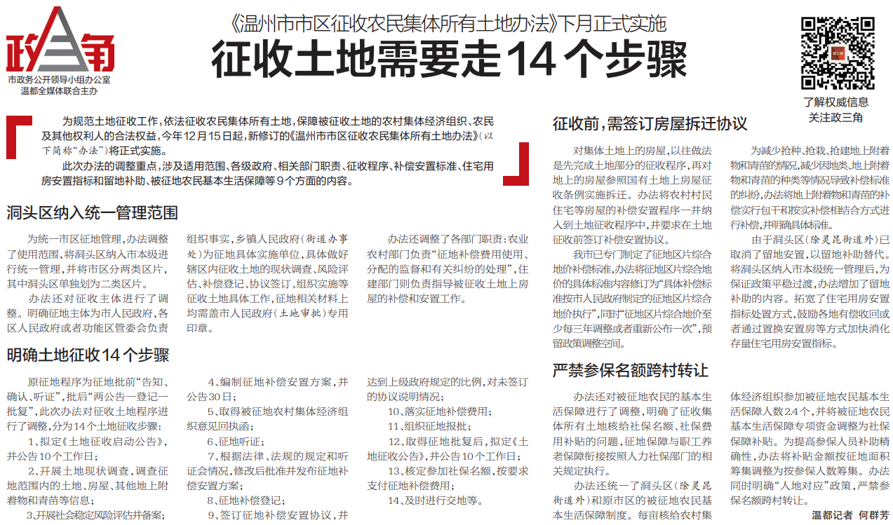 为规范土地征收工作,依法征收农民集体所有土地,保障被征收土地的农村集体经济组织、农民及其他权利人的合法权益,今年12月15日起,新修订的《温州市市区征收农民集体所有土地办法》(以下简称“办法”)将正式实施。