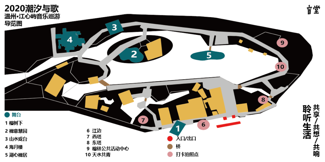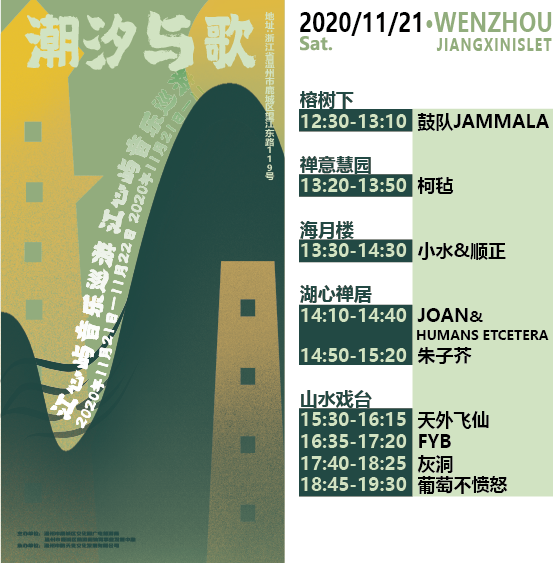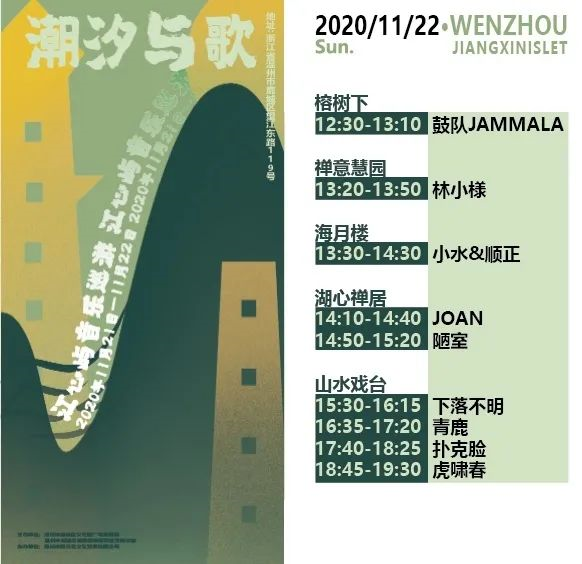 改造提升后的江心屿,古木葱茏,美不胜收,总能找到舒服的休闲方式。本次音乐巡游活动将设“榕树下”、“禅意慧园”、“海月楼”和“湖心禅居”和“山水戏台”等5个舞台,在两天时间内,每天中午12:30开始到19:30,来自温州本土以及北京、广州等地区的柯毡、扑克脸等十余支乐队,将在不同的时间节点、不同的舞台,“贩卖”快乐,制造愉悦,和游客共同创造一个别样的周末。