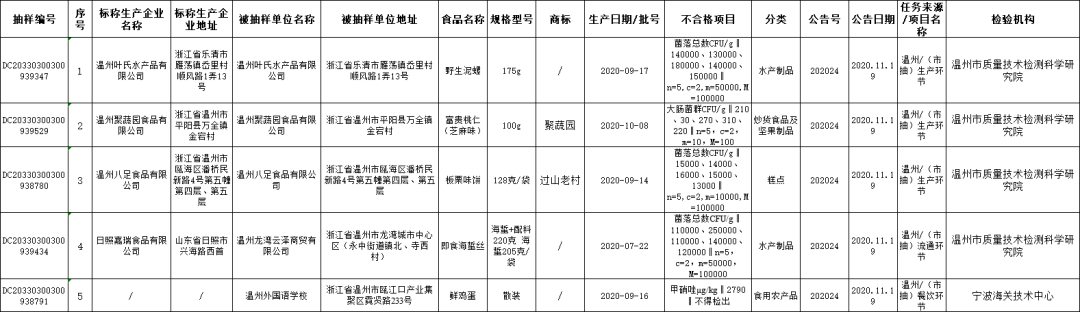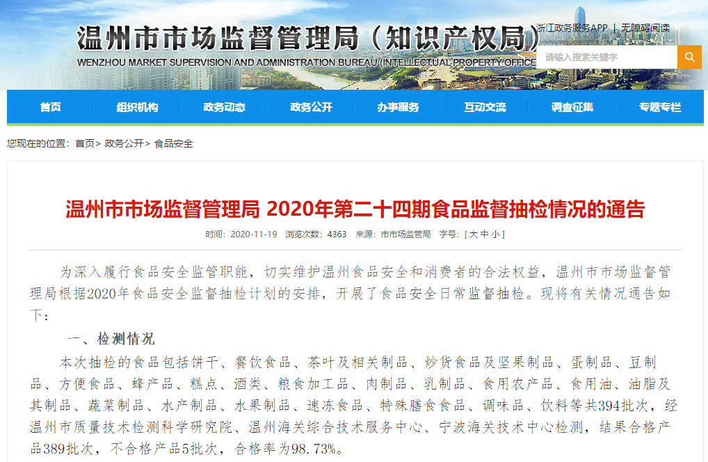 温州市市场监督管理局 2020年第二十四期食品监督抽检情况的通告 为深入履行食品安全监管职能,切实维护温州食品安全和消费者的合法权益,温州市市场监督管理局根据2020年食品安全监督抽检计划的安排,开展了食品安全日常监督抽检。现将有关情况通告如下: 一、检测情况 本次抽检的食品包括饼干、餐饮食品、茶叶及相关制品、炒货食品及坚果制品、蛋制品、豆制品、方便食品、蜂产品、糕点、酒类、粮食加工品、肉制品、乳制品、食用农产品、食用油、油脂及其制品、蔬菜制品、水产制品、水果制品、速冻食品、特殊膳食食品、调味品、饮料等共394批次,经温州市质量技术检测科学研究院、温州海关综合技术服务中心、宁波海关技术中心检测,结果合格产品389批次,不合格产品5批次,合格率为98.73%。 二、不合格食品情况 (一)温州叶氏水产品有限公司生产的野生泥螺,菌落总数检出值(CFU/g):140000、130000、180000、140000、150000,标准规定为:n=5,c=2,m=50000,M=100000。 (二)温州聚蔬园食品有限公司生产的富贵桃仁(芝麻味),大肠菌群检出值(CFU/g):210、30、270、310、220,标准规定为:n=5,c=2,m=10,M=100。 (三)温州八足食品有限公司生产的板栗味饼,菌落总数检出值(CFU/g):15000、14000、16000、15000、13000,标准规定为:n=5,c=2,m=10000,M=100000。 (四)温州龙湾云泽商贸有限公司销售的标称日照嘉瑞食品有限公司生产的即食海蜇丝,菌落总数检出值(CFU/g):110000、250000、110000、140000、120000,标准规定为:n=5,c=2,m=50000,M=100000。 (五)温州外国语学校购进鲜鸡蛋,甲硝唑检出值(μg/kg):2790,标准规定为:不得检出。 三、不合格项目分析 菌落总数:各种微生物可以直接或间接地通过多种途径污染食品,并不断利用食品中的丰富营养生长繁殖,导致食品腐败变质。消费者食用超标严重的食品,很容易患痢疾等肠道疾病,可能引起呕吐、腹泻等症状,危害人体健康安全。菌落总数超过标准值说明企业未按要求严格控制生产加工过程的卫生条件或是包装容器受污染;此外,还有可能与产品储运条件控制不当等有关。 大肠菌群:大肠菌群是评价食品卫生质量的重要指标之一。在食品生产加工、运输和销售过程等各个环节,生产设备不干净、工人不注意卫生、杀菌设施失控、包装车间和销售环境太差均有可能导致大肠菌群超标。消费者食用大肠菌群超标严重的食品,很容易患痢疾等肠道疾病,可能引起呕吐、腹泻等症状。 本次检出大肠菌群超标的产品均未检出其他致病菌,结合居民膳食结构、抽检情况等因素综合分析,健康风险较低,但反映该食品卫生状况不达标。 甲硝唑:甲硝唑主要用于治疗或预防厌氧菌引起的系统或局部感染。GB31650-2019 食品安全国家标准 食品中兽药最大残留限量中规定甲硝唑作治疗用,但不得在动物性食品中检出的兽药。甲硝唑常见的不良反应有恶心、呕吐、厌食、腹泻、腹痛等消化道反应,对循环系统、泌尿系统、呼吸系统也有影响。严重可致大疱性表皮松解型药疹,过敏性休克。 四、处理措施和消费提示 对抽检中发现的不合格产品,温州市市场监督管理局已要求各属地市场监管部门责令相关单位立即停止生产、销售、采取下架等措施,控制风险,并依法予以查处,确保后处理到位并根据实际情况积极开展追溯工作。其他经销与本次检测被判定不合格食品相同品牌、相同货品、相同批号食品的,也应立即停止销售,主动撤柜,并做好善后处理工作。特别提示消费者,如发现上述不合格食品或合法消费权益受到损害,请及时拨打12345电话向市场监管部门投诉、举报。 温州市市场监督管理局 2020年11月19日 不合格名单 ↓↓↓