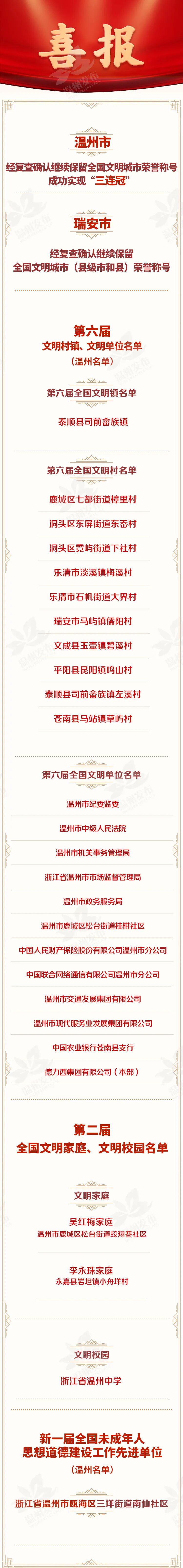 11月20日,全国精神文明建设表彰大会在北京举行。温州市经复查确认继续保留全国文明城市荣誉称号,成功实现全国文明城市“三连冠”。瑞安市经复查确认继续保留全国文明城市(县级市和县)荣誉称号。此外,我市多家单位入选第六届文明村镇、文明单位,第二届全国文明家庭、文明校园,新一届全国未成年人思想道德建设工作先进单位名单。