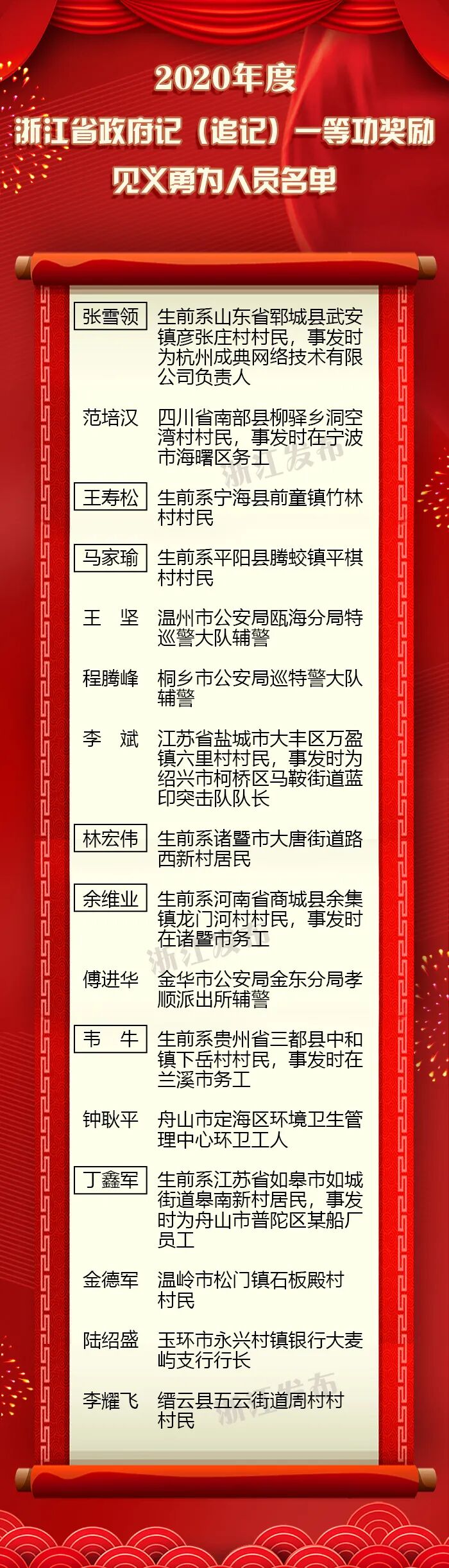 浙江省人民政府近日发布《关于给予张雪领等16位见义勇为先进人物记功奖励的决定》,为范培汉、王坚、程腾峰、李斌、傅进华、钟耿平、金德军、陆绍盛、李耀飞记一等功,为张雪领、王寿松、马家瑜、林宏伟、余维业、韦牛、丁鑫军追记一等功。