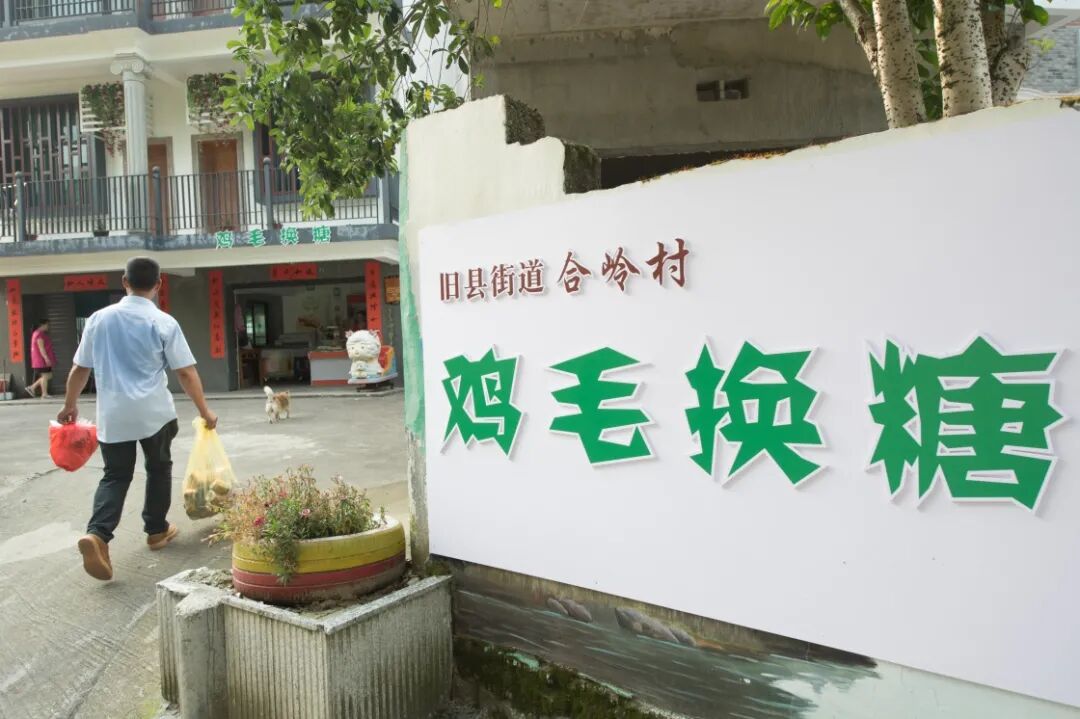 浙江桐庐旧县街道合岭村村民提着分类好的垃圾来到“鸡毛换糖”垃圾回收点兑换生活用品。图片来源:新华社 记者 翁忻旸 摄