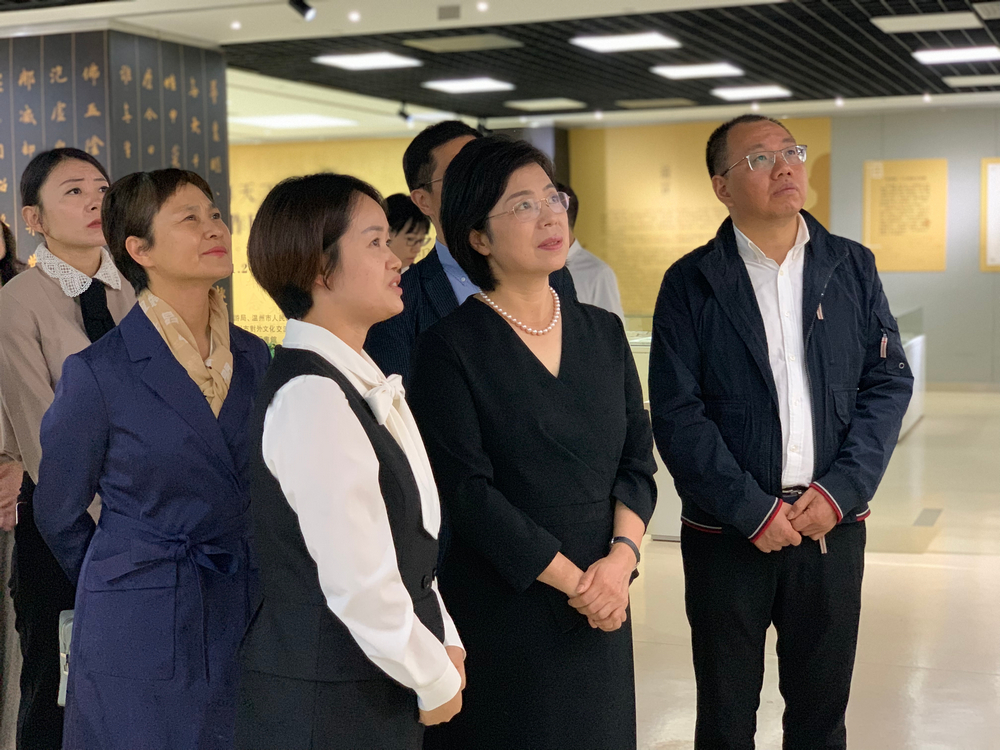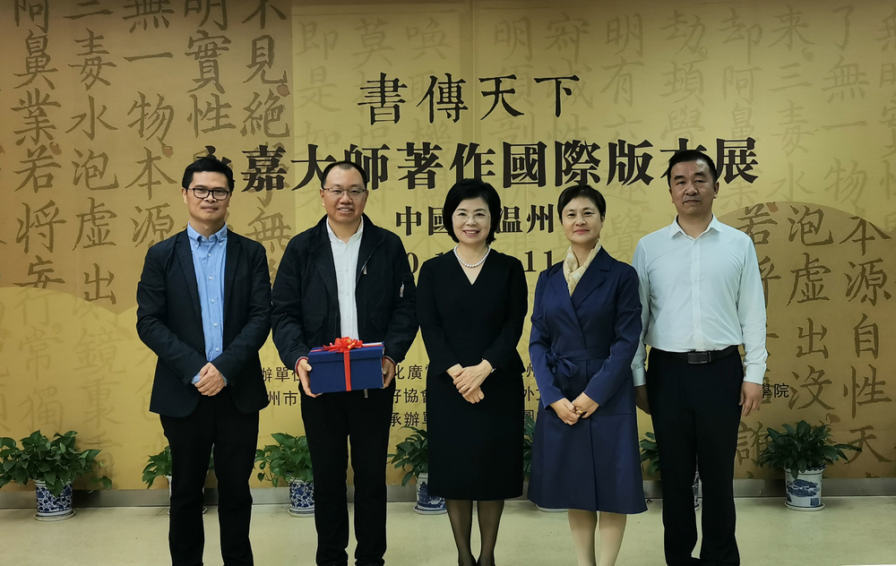 温都讯 11月22日下午,“书传天下——永嘉大师著作国际版本展”闭幕之际,市委常委、统战部长施艾珠在市文化广电旅游局局长朱云华、副局长李方喜和市民宗局副局长马建星等陪同下,参观了本次展览并出席了捐赠仪式。
