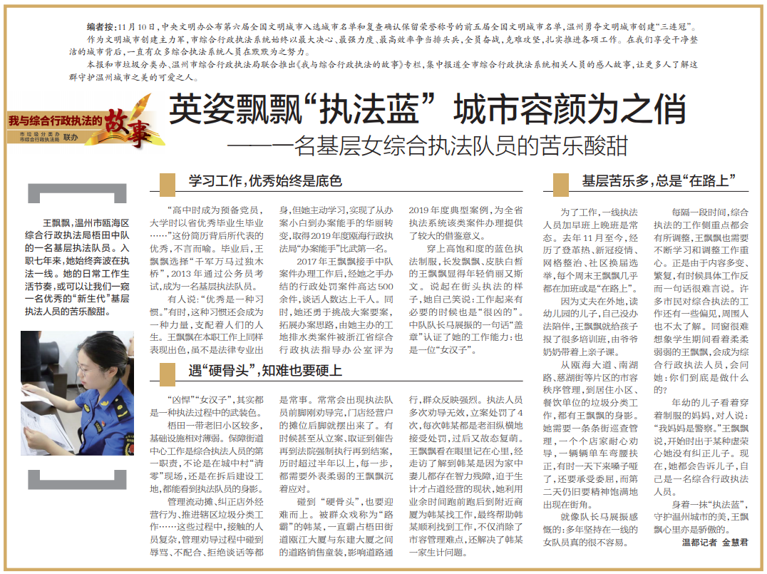 身着一抹“执法蓝”,守护温州城市的美,王飘飘心里亦是骄傲的。