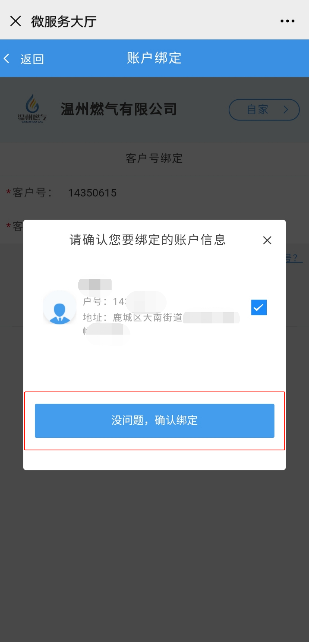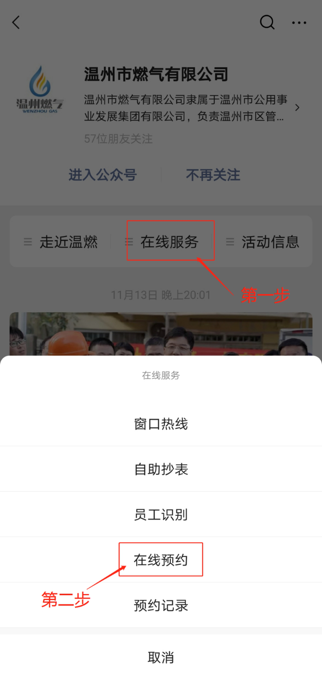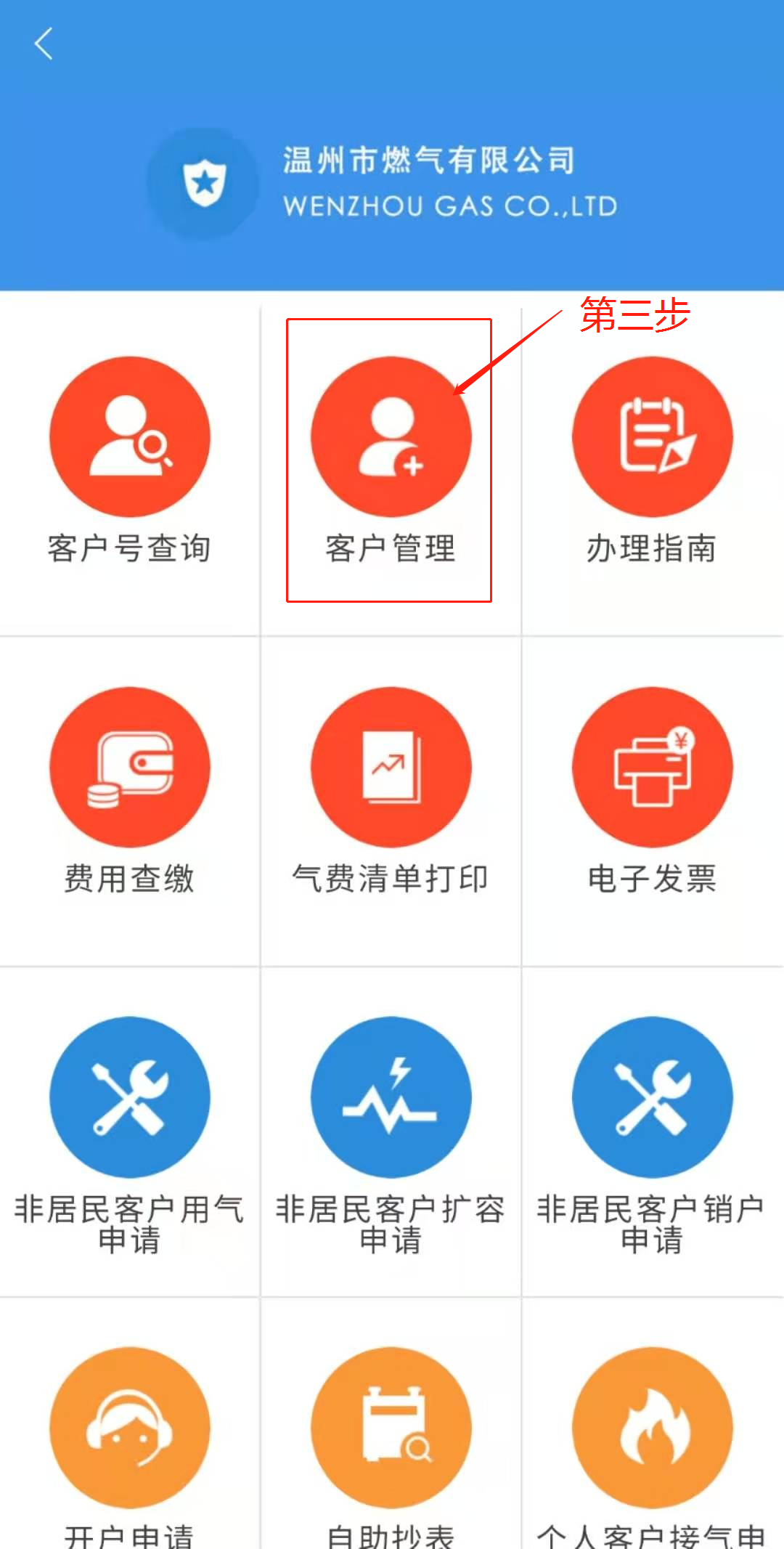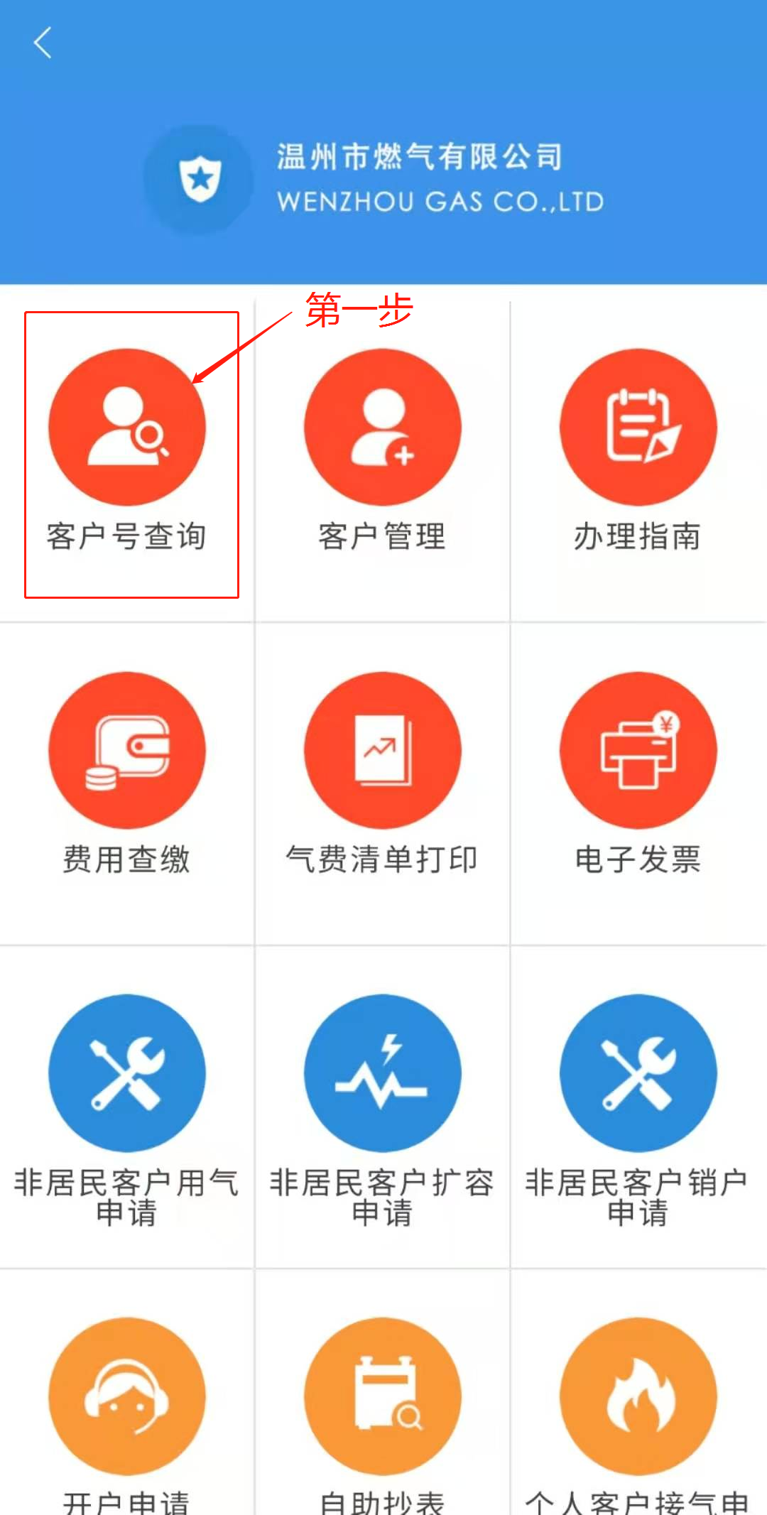 关注“温州市燃气有限公司”微信公众号,点击“在线服务”进入“在线预约”,通过“客户管理”绑定客户编号后,即可办理“费用查缴”“气表过户”“开具气费电子发票”等相关用气业务。