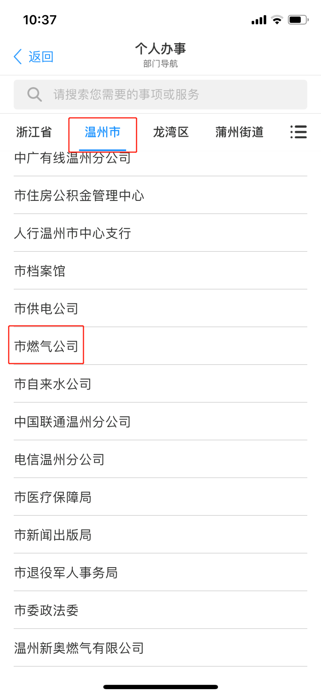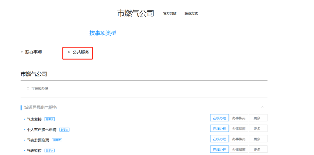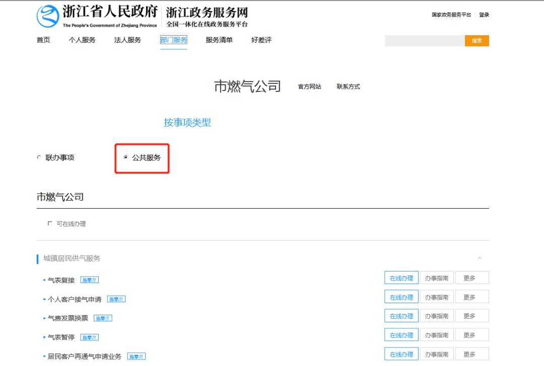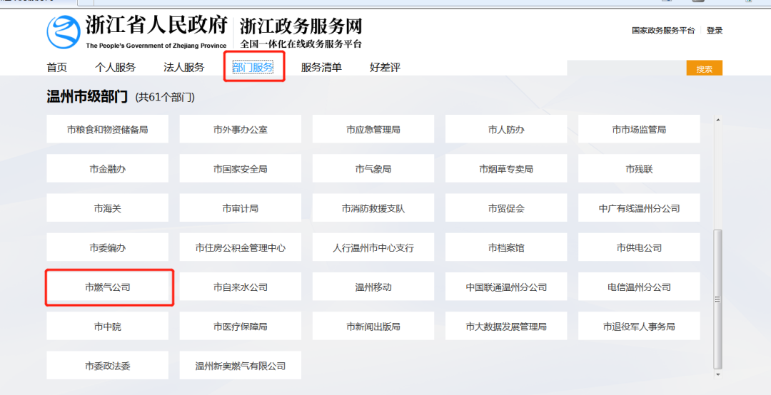 登录浙江政务服务网(http://www.zjzwfw.gov.cn)中的“政务服务”选择“温州市”点击“部门服务”里的“市燃气公司”进入“公共服务”即可办理17项供用气业务。