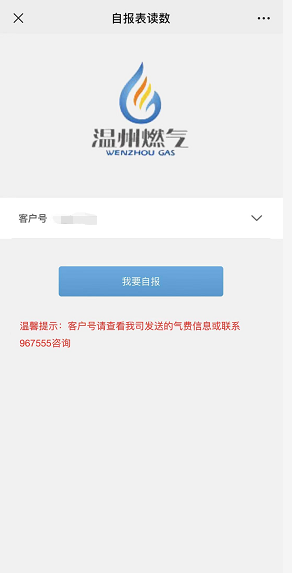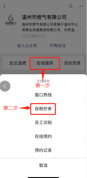 微信关注“温州市燃气有限公司”公众号,点击“在线服务”功能,进行燃气自助抄表(如未绑定客户,进入自助抄表后先进行首次的客户绑定)。