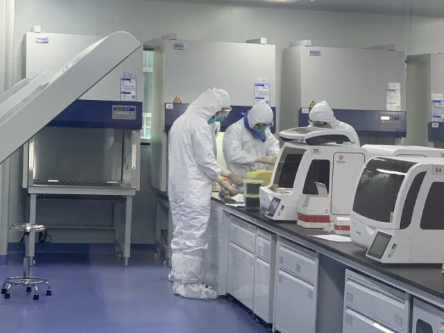 温州市中心医院(温州市第六人民医院)核酸检测基地建设面积1200平方米,包含了1个试剂准备区、3个核酸前处理区、1个扩增分析区、2个应急仓库等分区,配备有14台生物安全柜、5台全自动前处理仪、8台半自动前处理仪、28台PCR扩增仪、14台低温冰箱、7台高压灭菌锅等设备,实现检测全流程无缝隙管理,可一次性容纳每日100名工作人员4班次的同时运作,保证日检测能力达到3万份,形成核酸检测工作平时练兵,战时高效运转的快速反应机制。