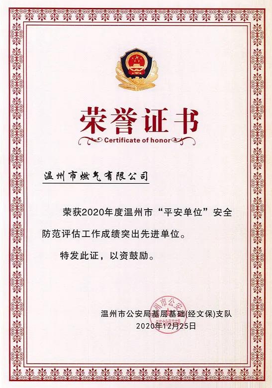 喜报 | 燃气公司荣获2020年度温州市“平安单位”安全防范评估工作成绩突出先进单位