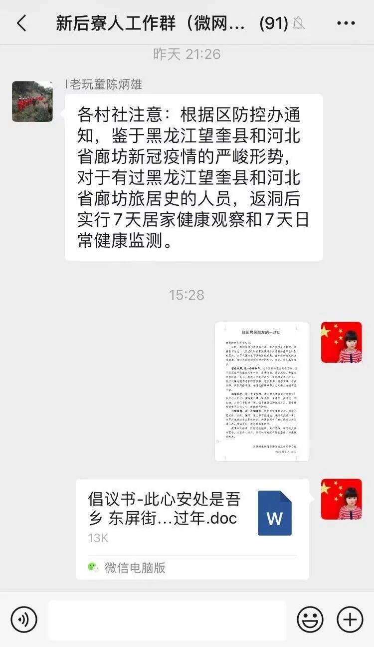 此外,各村社通过微信联系、电话摸排等方式全面掌握返乡人员情况、行程情况,引导其就地过年,可以用微信、网络、电话等方式拜年。