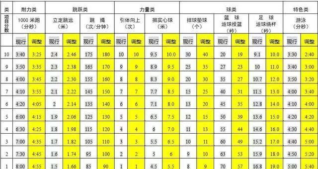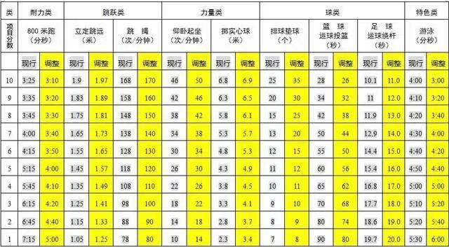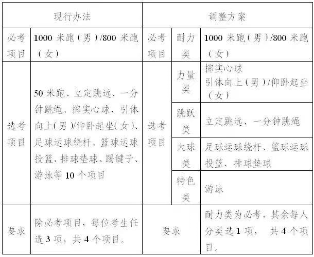 从项目上来看,除必考项目1000米(男)/800米(女)不变外,选考项目去掉了50米跑和踢毽子两类。其余的考试项目被分为力量类、跳跃类、大球类、特色类四个类别。其中力量类包括掷实心球、引体向上(男生)/一分钟仰卧起坐(女生);跳跃类包括立定跳远、一分钟跳绳。足球运球绕杆、篮球运球投篮、排球垫球为大球类。游泳是特色类。新要求规定,考生需按类别选择其中一项进行测试,耐力类为必考项目。如考生选择特色类游泳项目,则在其它三类中选择两类里的各一项进行测试;如未选择游泳项目,则在其他三类中分别选择一项进行测试。