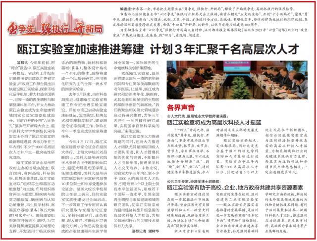 温都讯 今年年初省、市“两会”报告中,瓯江实验室被一再提及。省政府工作报告明确提出要组建瓯江等省实验室,市政府工作报告提出加快建设瓯江实验室,探索市场化运作机制,着力打造全国第一、世界一流的再生调控与眼脑健康科创平台,并大力推动瓯江实验室成为生命健康领域国家实验室重要组成部分。日前召开的全市“六比争先”强执行开新局大会上,温州医科大学学术副校长宋伟宏院士介绍了瓯江实验室的最新筹建进展,表示力争在三年内招引不少于1000名高层次人才并产生一批突破性研究成果。