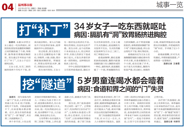 温都讯 因为身体内的一扇“门”失灵,5岁的乐清男童小东(化名)肚子很饿,却吃不下东西。开始是饭咽不下,后来连喝水都会噎着。近日,医生在他的食道里“挖”了一条“隧道”,术后第二天就能喝水了。