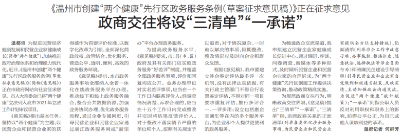 为促进民营经济健康发展和民营企业家健康成长(简称“两个健康”),加快推进政府治理体系和治理能力现代化,近日,《温州市创建“两个健康”先行区政务服务条例(草案征求意见稿)》(简称《意见稿》)正在市政府网站向社会征求意见。市人大常委会已将“两个健康”立法列入我市2021年立法工作计划审议项目。