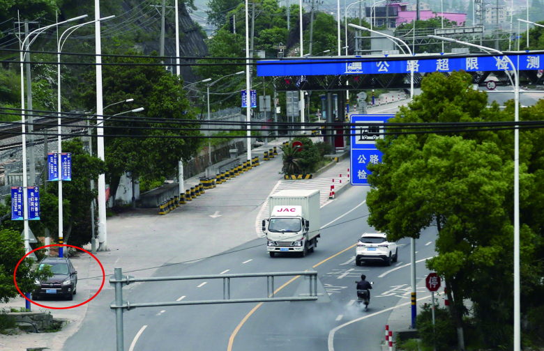 ↑温州330国道沿线一处超限检测点附近停靠着一辆疑似“盯梢车”。